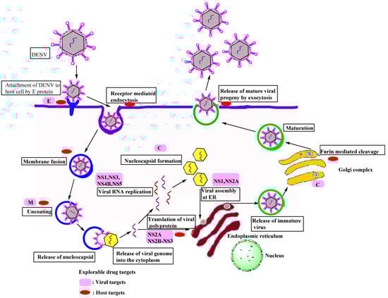 DENV primarily focuses on dendritic cells (DCs), monocytes/macrophages, B cells, T cells, endothelial cells, hepatocytes, and brain cells of the host. DENV reaches the target cell in a serotype-specific manner via non-specific receptor-mediated endocytosis. The DENV life cycle is depicted in Figure 2. Heparan sulfate, DC-SIGN, CD-14, HSP-90, HSP-70, mannose receptor, GRP-78, high-affinity laminin receptor, TIM-1, TAM, AXL, and claudin-1 are some of the most well-known receptors for endocytosis [12,13,14]. Envelope proteins on virus surfaces attach to these receptors on the host cell to drive viral particles to the endocytic route. The envelope protein experiences a significant structural change in the endosome due to the lower pH. Because of these modifications, the E protein adheres to the endosomal membrane that allows the nucleocapsid to be uncoated; finally, the discharge of the viral genome to the cytoplasm occurs [14].
