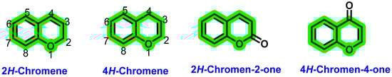 Natural and synthetic flavonoids belong to this class of chromene derivatives. The basic skeleton of flavonoids is C6-C3-C6. The different categories of flavonoids arise because of the different oxidation levels of the three-carbon units in the C ring. Flavonoids have various subclasses: flavones, flavonol, flavanol, flavanolol, flavanones, isoflavones, and anthocyanidins [44,58]. Based on the ability to inhibit a particular target, the authors reviewed the potential of various chromene analogues, which are summarized in the later parts.
