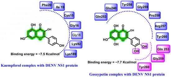 Hydrogen bonding (pink) and hydrophobic interactions (blue) of kaempferoland gossypetin with DENV NS1protein.