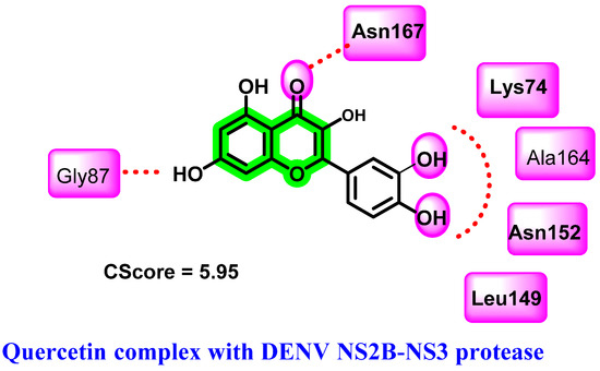 Based on the platelet count increment associated with the administration of Carica papaya leaves, major phytochemicals belonging to chromene derivatives were isolated and their anti-DENV activity evaluated [64]. Molecular modeling studies suggested that quercetin is the key phytochemical for exerting a DENV inhibition, where a stable binding pattern is observed with NS2B-NS3 protease. Binding affinities were evaluated using the consensus scoring function (CScore) and it was highest for quercetin (5.95). A prominent hydrogen bonding interaction with Asn152, Ala164, Lys74, Asn167, Leu149, and Gly87 of NS2B-NS3 with quercetin was revealed (Figure 6). In silico ADMET prediction (Lipinski’s rule of five) further suggested the drug-likeness possibilities of quercetin. Further in vivo studies were conducted to determine the effects on platelet count. A significant rise in platelet count has been observed with the administration of leaf extract of Carica papaya (at 400 mg/Kg and 800 mg/Kg concentrations) to a cyclophosphamide-induced rat [60]. Isatis tinctoria, a traditional Chinese medicinal herb used to treat dengue virus infection, also contains quercetin as one of its active ingredients [40].