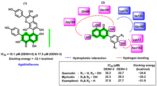 In another study, Sousa et al. [65] evaluated six different flavonoids (agathisflavone, quercitrin, isoquercitrin, myricetin, quercetin hydrate, and kaempferol) for their DENV inhibitory properties. Amongst the screened analogues, agathisflavone, a biflavonoid, was found to have potential for DENV-2 and DENV-3 strains (noncompetitive NS2B-NS3 serine protease inhibitor). The inhibitory activity of these molecules has been identified by using a substrate-free microscale thermophoresis (MST) assay. The IC50 value was 15.1 and 17.5 μM against DENV-2 and DENV-3 strains. By analyzing the IC50 values, not much difference was found between the glycosylated flavonols and the aglycones. In vitro inhibitory potential was further correlated with molecular modeling reports. NS2B-NS3 protein, derived from DENV-3 serotype with the co-crystallized ligand, Bz-nKRR-H (PDB ID:3U1I), was used as a protein target and molecules were docked to the specific allosteric binding point adjacent to the catalytic triad. The 3,5,7,4′- hydroxyl group formed hydrogen bonding with Gln88, Gln167, Gly124, Asn152, and Lys73 residues in the binding pocket. Hydrophobic interactions were also found with Lys74, Ile123, and Gln167. The meta hydroxyl group did not exhibit any interaction with the target protein (Figure 7). A reversible noncompetitive inhibitory nature of agathisflavone and myricetin was derived through the enzyme kinetic analysis (DENV-2 NS2B-NS3 protease). On the contrary, Powers and Setzer [66] reported that the agathisflavone has lower docking binding affinity (−33.1 kcal/mol) towards DENV protease, also a violation of Lipinski’s rule of five since its molecular weight is 522.46 g/mol.