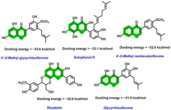 In 2016, Powers and Setzer [66] performed the virtual screening of 2194 phytochemicals (including 349 flavonoids and 120 isoflavonoids) against various DENV protein targets as follows: crystal or NMR structures of NS2B-NS3protease, NS3 helicase, envelope protein, NS5 RdRp, and methyltransferase (MTase). Amongst those screened analogues five chromene derivatives exhibited strong binding interactions with the catalytic triad of NS2B-NS3 protease target (PDB ID: 2M9P and 2M9Q) (Figure 8). None of the flavonoid ligands have notable binding affinities with the DENV helicase and RdRp. The docking results showed excellent binding of polyphenolic compounds with the DENV target proteins. It is interesting to note that the substitution of isoprene functionalities (prenyl and geranyl) resulted in an enhancement in binding potential towards the target.