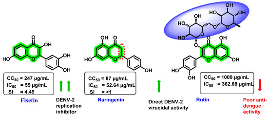 In vitro activity of three natural flavonoids (fisetin, naringenin, and rutin) against DENV was investigated (Figure 10) by Zandi et al. [70]. Foci-forming unit-reduction assay (FFURA) and quantitative reverse transcriptase-polymerase chain reaction (qRT-PCR) were used to assess the in vitro effectivity. Amongst these analogues, fisetin exhibited a dose-dependent inhibitory activity in DENV replication, while naringenin showed direct DENV-2 virucidal activity (IC50 = 52.64 µg/mL). Further, rutin exerted poor inhibitory activity. The CC50 value against Vero cells was 247, 87, and >1000 µg/mL, respectively, for fisetin, naringenin, and rutin. After virus adsorption to the Vero cells, fisetin exhibited an IC50 value of 55 µg/mL with SI of 4.49. However, fisetin treatment (5 h prior to viral infection) demonstrated an IC50 value and SI of 43.12 µg/mL and 5.72. At a 50 µg/mL concentration, fisetin decreased the DENV-2 RNA level by 65%, while naringenin reduced it by 50%. The actual mechanism for the inhibitory potential of fisetin is uncertain. However, it is suggested that forming a complex with the viral genome prevents further replication or interferes with the RdRp of the NS5 protein. Naringenin has high cytotoxicity (87 µg/mL) and SI < 1. The inactivity of naringenin may be due to unsaturation at the C2–C3 bond, whereas that of rutin may be due to glycoside group attachment at the C3 position. However, contradictory results were found in in silico [67] and in vitro [71] studies, which showed rutin as a potent DENV NS3 pro inhibitor with an IC50 of 362.68 μg/mL.