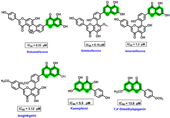 Another critical study related to flavonoids was based on biflavonoids isolated from natural sources that showed potent inhibition against DENV-NS5 RdRp [74,75]. Coulerie P et al. evaluated the structure–activity relationship of 23 compounds, including four biflavonoids isolated from Dacrydium balansae (amentoflavone, podocarpusflavone A, isoginkgetin, and hinokiflavone), six biflavonoids isolated from Dacrydium araucarioides (robustaflavone, sotetsuflavone, etc.), ten apigenin derivatives, hexamethyl-amentoflavone, and cupressuflavone.