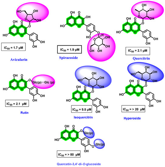 Antoine et al. [76] evaluated various natural flavonoids against the DENV NS5 RdRp. Amongst the screened flavonoids, five were obtained from Carpolepis laurifolia leaf extract (quercetin, 6-methylapigenin-7-methylether, avicularin, quercitrin, and hyperoside), while four were commercially procured (isoquercitrin, spiraeoside, quercetin-3,4′-di-O-glucoside, and rutin) (Figure 12). It is noteworthy that all these flavonoids possessed a sugar unit attachment at various positions. Amongst the screened analogues, avicularin (with rhamnose sugar) and quercitrin (with arabinose sugar) demonstrated potential activity towards DENV RdRp, while hyperoside and isoquercitrin, with galactose and glucose at the third position of quercetin, respectively, showed poor inhibitory potentials. Furthermore, spiraeoside with glucose at the C-4′ place displayed inhibitory activity, while quercetin-3, 4′-di-O-glucoside with another glucose substituent at the C-3 position possessed a lesser inhibitory effect. These results were in contrast with the reports of Zandi et al. [70], wherein sugar attachment possessed a weaker potential.