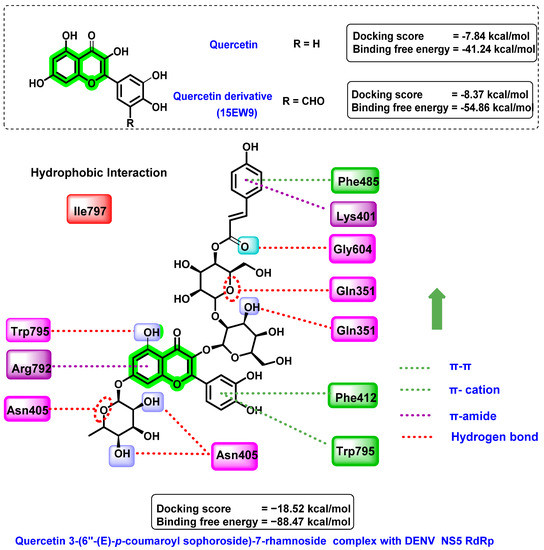 Based on these promising results, a further set of similar quercetin structures was retrieved from the PubChem database and screened for the identification of anti-DENV lead compounds. Quercetin 3-(6″-(E)-p-coumaroyl-sophoroside)-7-rhamnoside has a higher docking affinity (−18.52 kcal/mol) than quercetin and its derivatives (Figure 13). Various interactions, such as hydrogen bonding, hydrophobic interactions, and π–cation interactions, were formed by the screened analogue towards the targets. Interactions with amino acid residues, such as Trp795, Arg792, and Gln351, were found to be critical for their anti-dengue virus activity. Trp795 performs a vital role in the entry and release of RNA template as well as stabilization of the polymerase–template complex. Quercetin 3-(6″-(E)-p-coumaroyl-sophoroside)-7-rhamnoside has a free binding energy of −88.47 kcal/mol. From the molecular dynamic simulation studies, it was found that water bridges and hydrogen bonds were essential for the stability of the polymerase–ligand complex. Further pharmacokinetic studies suggested the druggability of these molecules against dengue fever.