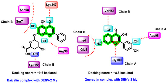 In another report, in silico binding affinities of various flavonoids with DENV-2 E protein were studied by Ismail et al. The selected flavonoids include baicalein, baicalin, epigallocatechin gallate (EGCG), fisetin, flavone, glabranine, hyperoside, ladanein, and quercetin (Figure 14) [72]. The structure of the E protein was prepared by homology modeling, isolated from DENV-2 Malaysia (DENV-2 My). The flavonoid consensus binding pocket was generated by the residues 4–9 and 151–154 from domain I of chain B and residues 98–103 and 244–247 from domain II of chain A.