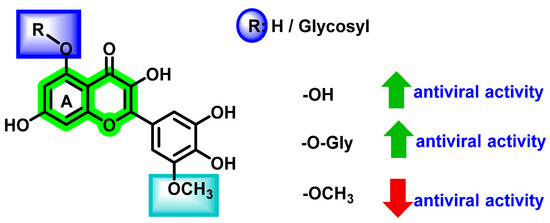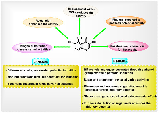 Molecular modeling studies suggested that the polyphenolic groups present in quercetin and fisetin favor the anti-dengue virus activity. These compounds have interactions with NS5 RdRp and inhibited various stages of viral replication [72,73]. Further attachment of sugar moieties resulted in detrimental effects towards DENV.