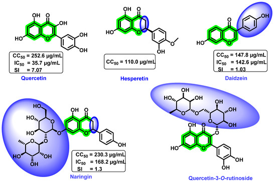 Structure, CC50, and IC50 of fisetin, naringenin, and rutin.