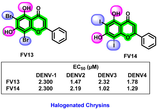 - Suroengrit, A.; Yuttithamnon, W.; Srivarangkul, P.; Pankaew, S.; Kingkaew, K.; Chavasiri, W.; Boonyasuppayakorn, S. Halogenated chrysins inhibit dengue and zika virus infectivity. Sci. Rep. 2017, 7, 13696. [Google Scholar] [CrossRef] [PubMed]