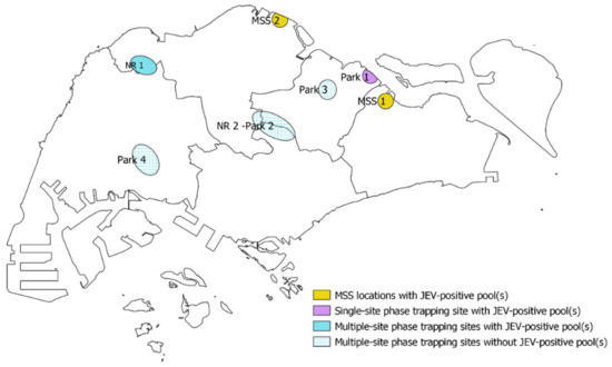 Additionally, Culex genus mosquitoes that were trapped from November 2020 to May 2021 as part of the malaria surveillance activities of the National Environment Agency (NEA) were also included in this study. The Malaria Surveillance Section (MSS) conducts on-going catches using the Night Catcher (a modified form of the CDC light trap [38]) in 45-day cycles at 116 different locations in Singapore. Each MSS trapping session was carried out over a 12-h period overnight, including crepuscular periods. The two MSS trapping locations where JEV-positive pools were observed are indicated as MSS 1 and MSS 2 (Figure 1).
