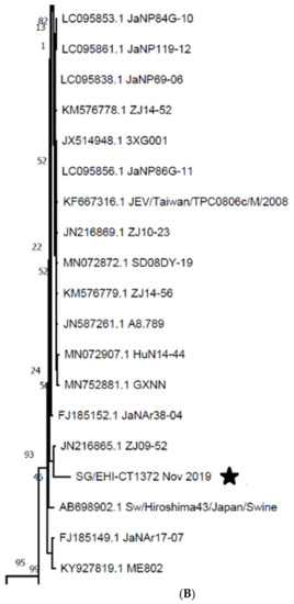 All of the JEV sequences (n = 10) generated during the present study from the mosquito pools collected from 2014 to 2021 belonged to GI. This is in contrast to the detection of JEV belonging to GII locally in 2011 [36]. This observation provides further empirical evidence for the establishment of genotype I as the predominant JEV genotype in Asia [23,24,25,59]. Nine of the ten new JEV E-gene sequences belonged to sub-genotype GI-a, which is strongly associated with the tropics, and is often found in South-east Asia [15]. The remaining sequence (SG/EHI-CT1372) belonged to sub-genotype GI-b, which is also known as a temperate sub-genotype, and is typically found in East Asia [15].