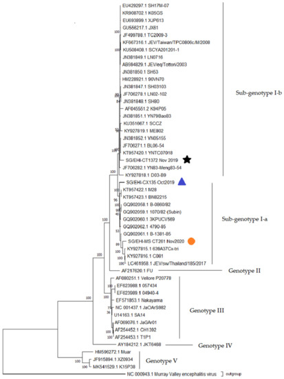 Maximum likelihood phylogenetic analysis of 50 JEV whole genome isolates. This tree was constructed using TN93+G+I with 1000 bootstrap iterations; the outgroup is MVEV (NCBI Reference Sequence no. NC_000943.1). The JEV isolates presented in this study are indicated with a star: SG/EHI-CT1372; blue triangle: SG/EHI-CX135; orange circle: SG/EHI-MS_CT261. The colors correspond to the clusters indicated in Figure 2. Genotypes are as indicated. Each node is labelled with the GenBank Accession No. (where available) followed by the isolate name.