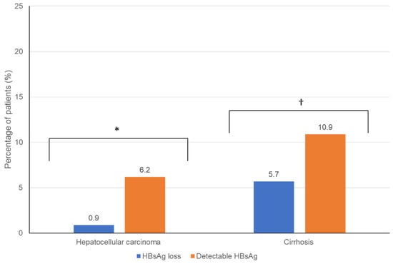 Percentage of CHB patients who achieved HBsAg loss vs. those remaining HBsAg-positive who developed the end-stage liver disease (i.e., HCC and cirrhosis). * p < 0.001. † p ≤ 0.001.