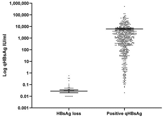 Quantitative HBsAg values in CHB patients who achieved HBsAg loss versus patients with positive HBsAg. HBsAg, hepatitis B surface antigen; IU, international units; qHBsAg, quantitative hepatitis B surface antigen.