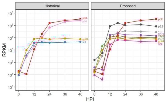 The promoters included on commercially available transfer plasmids have drastically different transcription profiles. (Left panel). The transcript abundance of AcMNPV polh, p10, gp64, and ie1 ORFs, which are among the only promoters available on commercial transfer plasmids for foreign gene expression. (Right panel). The transcript abundance profiles of AcMNPV ORFs selected for evaluation of the upstream promoter regions in this study. Promoters were selected for expression profiles between polh/p10 and gp64/ie1.