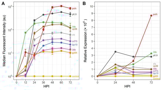 - George, S.; Jauhar, A.M.; Mackenzie, J.; Kieβlich, S.; Aucoin, M.G. Temporal characterization of protein production levels from baculovirus vectors coding for GFP and RFP genes under non-conventional promoter control. Biotechnol. Bioeng. 2015, 112, 1822–1831. [Google Scholar] [CrossRef] [PubMed]