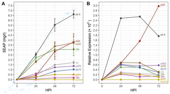 Production of extracellular SEAP from selected AcMNPV promoters. (A) Yield of SEAP (mg/L) of culture supernatants measured using a colorimetric SEAP activity assay and (B) relative transcript abundance measured using RT-qPCR at 24, 48, and 72 h post infection.