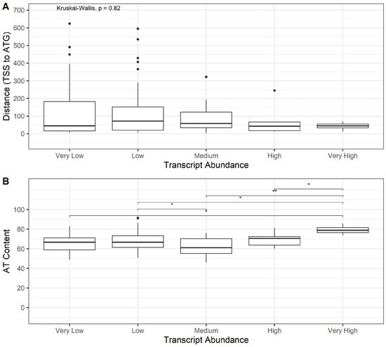 Evaluation of the 5UTRs of AcMNPV ORFs categorized according to transcript abundance. (A) Length (in nucleotides) and (B) A/T content of the 5UTR between the late gene promoter motif (5-TAAG-3) and translation initiation codon (ATG). * p < 0.05, ** p < 0.01.