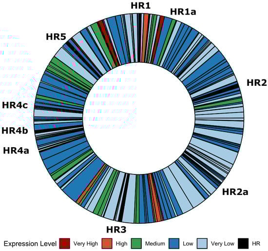 Various studies in the literature have suggested that the homologous repeat (hr) regions found in baculovirus genomes have roles as origins of DNA replication (oris) and as transcriptional enhancers that may act in both cis and trans. To investigate whether there was a relationship between transcript abundance and distance from a hr region, the genome map of AcMNPV was colour-coded according to class (Figure 5) and the distance from the 5 end of the hrs to the start codon of each gene was calculated (Figure 6). There did not appear to be any discernible relationship between ORF transcript abundance and proximity to any of the hrs.