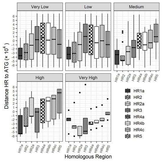 Distance (in nucleotides) between the start codon and 5 end of each homologous region for every AcMNPV ORF categorized according to transcript abundance. The distance was calculated by subtracting the genomic location of the 5 end of each AcMNPV ORF from the genomic location of the 5 end of each hr. Positive values represent ORFs located behind (clockwise) to the hr and negative values represent distances between ORFs that are located in front of (counterclockwise) the hr.