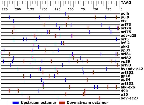 The approximate positions of the upstream octamer (blue) and downstream octamer (red) in regions upstream of the late gene promoter motif for the most abundant AcMNPV ORFs.