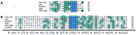 Finally, determining promoter motifs and the underlining mechanisms that control gene transcription is a major goal of computational biology [50]. However, aside from the late gene TSS motif (5-TAAG-3), regulation of late gene expression of AcMNPV is not well understood [18]. Aside from the previously described octamer sequences found upstream of the vp39 and p6.9 ORFs, a few studies have identified nucleotide regions that have a large impact on transcription by using linker-scan mutation and deletion strategies to systematically introduce targeted mutations and truncations within the promoter region of AcMNPV promoters [28,34,38,45,51,52,53,54,55]. Many of these studies have suggested that only 15–20 nucleotides upstream and downstream of the TSS motif is required for full strength promoter activity, except for the polh and p10 5UTRs which have binding sites for VLF-1 and are required for full activity [56]. However, each of these studies introduced multiple mutations simultaneously and among adjacent nucleotides, potentially obscuring complex and synergistic relationships between different nucleotide positions. For example, mutation of 7 or 13 nucleotides in the regions 9 to 18 nucleotides upstream or 6 to 19 nucleotides downstream, respectively, of the TSS of the vp39 promoter resulted in 50% reduction in transcriptional activity, while mutating 9/10 nucleotides between positions and reduced expression to 10% compared to the control [34]. In addition to consensus sequences derived from MSAs from each expression class, a MSA and subsequent consensus sequence was calculated for a curated group of promoter sequences that included all of the promoter regions from the High and Very High classes with the exception of the 2 very late promoters, p10 and polh. Previous studies have suggested that the sequences surrounding the TAAG motif of these promoters have a lower affinity for the vRNAP and function as inefficient late gene promoters [34,56]. Similar to the analysis of flanking TIS sequences, few clear patterns emerged; however, some similarities may be worthy of further exploration. For example, position is A in every sequence in the Curated class, and is T for polh and p10 and W (A or T) for the other classes. Similarly, and are conserved 5-AA-3 dinucleotide in the Curated class, however they are less conserved as promoter strength decreases. Interestingly, mutations that overlapped both of these sequences resulted in at least 50% reduction of vp39 promoter activity [34], and while these observations may be coincidental due to the small number of highly expressed AcMNPV ORFs, they may be worthy of experimental scrutiny to further examine their importance to late gene expression regulation.
