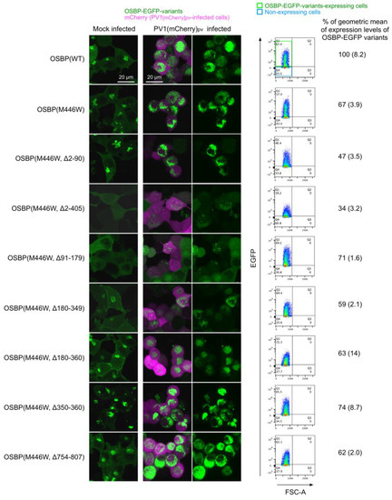 Subcellular localization and expression levels of the OSBP variants. (Left) Maximum projection view of HEK293 cells expressing the OSBP variants analyzed by confocal microscopy. The cells were infected with PV1(mCherry)pv at an MOI of 50 at 37 °C for 5 h. Images of the representative cells (mock-infected or PV1(mCherry)pv-infected cells) at 5 h p.i. are shown. (Right) Expression levels of the OSBP variants. The cells were analyzed by flow cytometry. The expression level of OSBP-EGFP(WT)-expressing cells is taken as 100%. The data are representative of two independent experiments with two or three biological replicates.