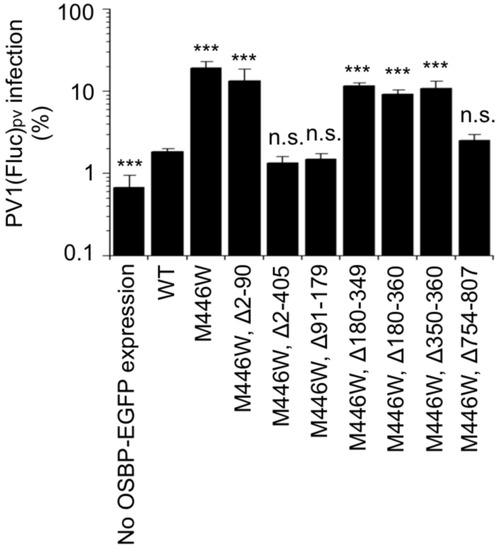 Recently, our group solved a crystal structure of the ORD of human OSBP [26]. Based on the crystal structure, we developed a novel functional dominance assay of OSBP using the M446W variant that could confer tolerance to an OSBP inhibitor T-00127-HEV2 [6,26], which inhibits the sterol transfer activity of endogenous WT OSBP [19]. Since OSBP serves as an essential gene in human cell lines [27], trans complementation assay with the knockout cells is not applicable for the characterization of OSBP. The functional dominance assay allows evaluation of in vivo function of OSBP by using ectopically expressed OSBP variants without using the knockout cells. In the present study, we characterize deletion variants of OSBP and define the essential domains of OSBP required for PV replication.