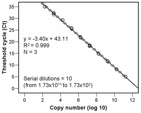 A ten 1:10 points serial dilution of the 94 bp specific qPCR product synthesized de novo and cloned into a plasmid pUC-GW-Kan (Azenta Life Sciences, Leipzig, Germany), and posterior regression equation analyses, permitted estimating the fragment copy number, actual number of the CHV-1 virus, in real samples depending on the mean threshold cycles number per triplicate wells (Figure 1). For calculating the copy number in the original plasmid aliquot, the copy number was calculated using the following equation: number of copies/µL = [(6 × 1023) × (DNA concentration, 500 ng/µL)/molecular weight of one plasmid], where 6 × 1023 is the number of copies per mole, DNA concentration is given in grams per microliter, and the molecular weight of one plasmid is in grams per mole assuming a plasmid size of 2627 bp and a 1 bp molecular weight of 660 g/mole.