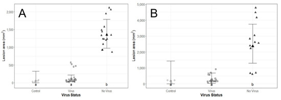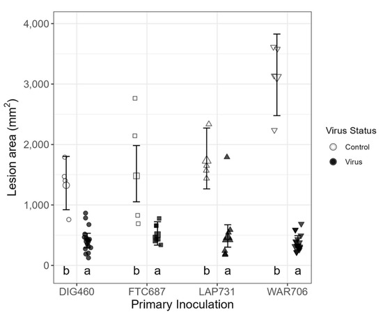 Lesion area by primary inoculation and challenge inoculation with virus or without virus (control) using seedlings. Points with error bars represent estimated marginal means with 95% confidence intervals. Lettering indicates significant differences between challenge inoculation with virus compared to the control. See Material and Methods third paragraph for experimental details.