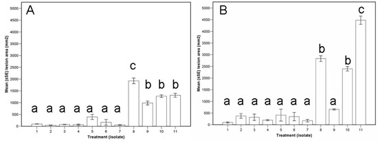 Lesion area 53 days after individual inoculation (assay I) with ten isolates of Cryphonectria parasitica (1–3 infected with the hypovirus CHV1-M2273, 4–6 infected with CHV1-M2357, and 8–11 virus-free isolates) and a PDA control (number 7). (Eleven treatments). Bars with the same letter are not significantly different based on Tukey′s test. (A) Seedlings (n = 44). (B) Branch segments (n = 33). See Material and Methods third paragraph for experimental details.