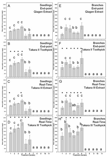 Virus concentration within the re-isolations after 53 days post individual inoculation (assay I, (A–D) using seedings, (E–H) using branch segments) with ten isolates of Cryphonectria parasitica (1–3 infected with the hypovirus CHV1-M2273, 4–6 infected with CHV1-M2357, and 8–11 virus-free isolates) and a PDA control (number 7). (Eleven treatments). Bars with the same letter are not significantly different based on a Tukey′s test. (A) Seedlings (n = 44). (B) Branch segments (n = 33). Bars with an asterisk indicate significant differences against the same isolate treatment analysed using the Qiagen Extract End-point PCR method for the CHV-1 mycovirus.
