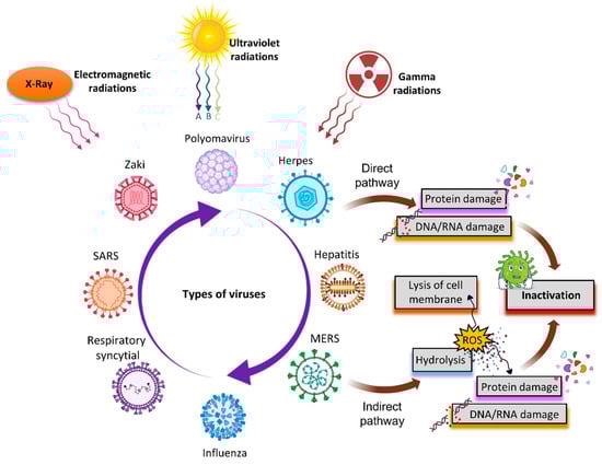 Radiations are well known to have several effects when interacting with biological systems [11,12,13,14,15,16]. The mechanism by which an electromagnetic field affects biological systems was presented well [11]. For the decontamination of various virus species, a variety of physical approaches have been used, including electromagnetic irradiation, X-rays, UV, and gamma radiations [17,18,19,20,21]. Radiation production is an ongoing subject of study [22,23,24,25,26,27,28,29,30,31,32] that is beneficial to our modern lives. Figure 1 graphically depicts the direct impact and mechanism of employing radiations to disinfect microorganisms. Irradiation is a low-energy, ecologically friendly, and safe way of killing viruses under carefully regulated conditions with little molecular modifications, which is particularly significant in the manufacture of biological reagents. The sun’s UV radiation in the atmosphere is the most effective natural germicide. Far-UVC light, with a wavelength range of 207–222 nm, on the one hand, probably eliminates germs without harming their natural equivalents [33].