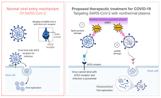 A decade ago, Yasuda et al. [111] proposed a biological technique to quantify the in vivo DNA damage caused by bacteriophage lambda viruses exposed to air plasma. Xia et al. conceived and built a packed-bed DBD plasma reactor that efficiently deactivated MS2 bacteriophages in aerosols utilizing a nominal pressure drop across the reactor for air sterilization against airborne bacteriophages. This method is beneficial for preventing viral infections from spreading through the air [112]. Several other researchers have discovered that plasma causes considerable protein oxidation of the viral coat or capsid. Through the action of ROS, plasma treatment makes bacteriophages dormant. However, further research is needed to figure out whether plasma operating parameters promote protein inactivation or viral DNA damage. A variety of NBP sources can fully inactivate or greatly limit the infectivity of multiple humans, animals, and plant harmful viruses, and a mechanism was proposed recently [55], as shown in Figure 2b. Furthermore, the process by which RONS is formed in NBP is based on Ar damage to the S protein. Reactive species created by plasma jets dissolve in liquid and cross-react in the liquid phase. RONS ONOO− and O2− oxidized tyrosine, tryptophan, and histidine at RBD and NTD, limit RBD’s ability to bind to the cell receptor ACE2 and NTD’s function as indicated in Figure 2c. Figure 3 illustrates the mechanism of inactivation of SARS-CoV-2 by using NBP. The spike proteins of the SARS-CoV-2 attach to the ACE2 receptor during normal viral entry and so enter the host cell for viral replications. When SARS-CoV-2 was exposed to NBP, the spike proteins were damaged, preventing the virus from binding to the ACE2 receptor and preventing infection. On the other hand, NBP also damages the DNA/RNA, which restricts the SARS-CoV-2 for viral replication.