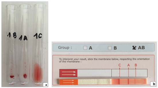 AB blood group system blood typing was performed at the Veterinary Transfusion Research Laboratory (REVLab), Department of Veterinary Medicine and Animal Sciences (DIVAS), University of Milan, Italy, using the agglutination on tube technique (Figure 1a), as previously described [2,43]. All samples identified as phenotypes B and AB with the tube technique were confirmed using an immunochromatographic test (Figure 1b) and the back typing technique, as previously described [2,43,44].
