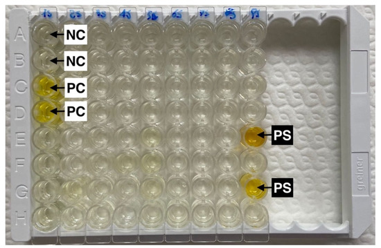 Double antigen ELISA that detects specific anti-SARS-CoV-2 nucleocapsid (N-Protein) antibodies (ID-Screen® ELISA, SARS-CoV-2 double antigen multi-species, ID.vet, Grabels, France). Two positive cat serum samples (PS, positive sample) show a sample/positive control (PC) ratio greater than 60%. The negative serum sample controls are indicated as NC (negative control).