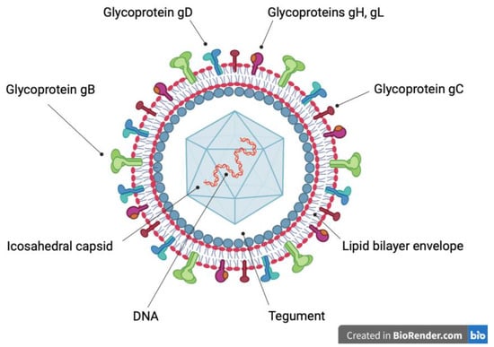 Schematic representation of the herpes virion. A linear, double-strand deoxyribonucleic acid (DNA) molecule (red and orange) is surrounded by an icosahedral capsid (light blue), which in turn is covered by tegument (white). The outer surface of the tegument (grey) is associated with a lipid bilayer envelope (red and grey), which contains integral glycoproteins. Glycoprotein B trimer (green), glycoprotein C monomer (brown), glycoprotein D homodimer (light blue), glycoprotein H (purple) and glycoprotein L (orange) heterodimer allow the entry of the virion into the host cell.