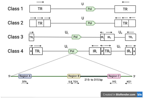 Classes of viruses belonging to the family Hespesviridae based on the arrangement of repeated sequences in the genome. Human herpesvirus-6A and Human herpesvirus-6B (subfamily β-herpesvirinae) and Equine herpesvirus-2 (subfamily γ-herpesvirinae) genomes belong to class 1, while many members of the subfamily γ-herpesvirinae belong to class 2; members of the genus Varicellavirus (subfamily α-herpesvirinae) belong to class 3 genome, whereas Herpes simplex virus (subfamily α-herpesvirinae) and Cytomegalovirus (subfamily α-herpesvirinae) belong to class 4. The pol gene, which contains three conserved regions (A, B and C), is present in the architecture of all genome classes (illustrations not at scale). These regions encode highly conserved amino acid domains (DFA, ILK, TGV, IYG and KG1). PCR primers (dashed arrows) according to VanDevanter et al. are shown under the different class architectures. Primer’s directions are specified by dashed arrows. The product obtained by the Panherpes nested PCR is between region B and region C. The nomenclature used in all classes is U (unique), UL (unique long), US (unique short), TR (terminal repeat), TRL (terminal long repeat), IRL (internal long repeat), TRS (terminal short repeat), IRS (internal short repeat); TRL and TRS include a (terminal direct repeat) and IRL and IRS aI (internal inverse repeat). The orientations of repeated sequences are specified by block arrows.