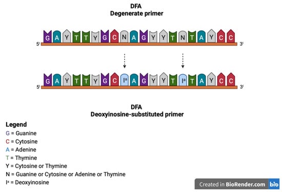 Representation of the deoxyinosine-substituted primers generated by Ehlers et al. modifying the original degenerate primers and introducing deoxyinosine in all primer positions with 3- and 4-fold degeneration. For example, in the DFA degenerate primer, the degenerate N base was substituted with Ia.