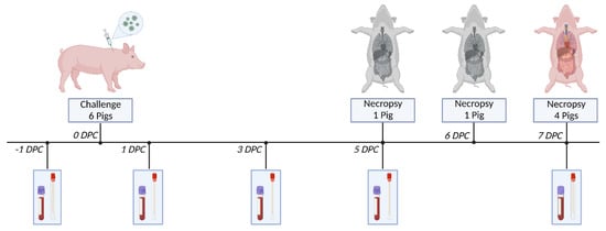 Clinical disease and progression of ASFV-MNG19 was assessed in six approximately 2-month-old crossbred male pigs (Figure 1). The animals were inoculated intramuscularly (IM) with 1 mL of ASFV-MNG19 (dose of 360 HAD50/mL) in the right lateral cervical region cranial to the point of the shoulder. This dose and the IM inoculation route were chosen for consistency with our previous studies to allow for comparison of these data with pigs infected with different ASFV strains. This study does not include other ASFV strains to avoid repetitiveness with our previous studies and reduce the unnecessary use of animals and resources. The IM route provides administration of a controlled dose and produces consistent disease progression. Following inoculation, daily body temperatures and clinical signs were recorded to assess disease progression. Daily health checks were performed every morning by team personnel, as well as in the evening when animals became febrile. Two animals were found dead and the remaining four were humanely euthanized using pentobarbital on 7 days post challenge (DPC) due to severe clinical signs. Necropsies were conducted on all animals, as described below.
