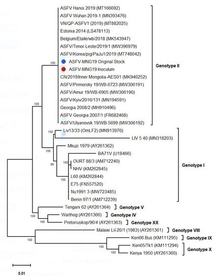 Phylogenetic tree of whole-genome sequences of ASFVs constructed using maximum likelihood approach with 1000 bootstrap replicates. The blue and red dots indicate the ASFV-MNG19 original stock and inoculum used in this challenge study, respectively.