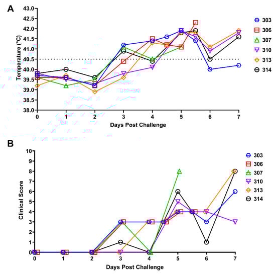 Clinical Observations of ASFV-MNG19 Infected Pigs. Daily body temperatures (A) and cumulative clinical score (B) of the 6 pigs challenged IM with ASFV-MNG19 from 0 DPC to 7 DPC. Data indicates individual values ((A) expressed as °C, (B) expressed as an integer value). Data for individual animals are shown. The dashed line in 3A indicates 40.5 °C which is considered a fever for this study.