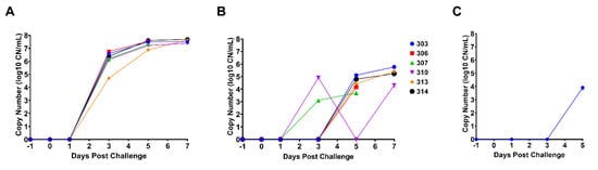 Quantitative real-time PCR for detection of ASFV p72 (B646L gene) DNA was performed on viral DNA extracted from EDTA whole blood collected at −1, 1, 3, 5, 6, and 7 DPC; the one blood sample from 6 DPC was collected from pig #306 which was found dead. At 3 DPC, pigs infected with the ASFV-MNG19 isolate had on average 2.49 × 106 CN/mL (Ct = 24.85) of viral DNA present in their blood. Viral loads increased by a log10 at 5 DPC and plateaued by 7 DPC (Figure 4A). The increasing viral loads correlated with the prolonged, severe pyrexia and increased clinical scores. Viral DNA was detected in OP swabs at 5 DPC from all animals, except pig #310, which had detectable viral DNA at 3 DPC but not at 5 DPC as a result of transient shedding or sampling technique (Figure 4B). The remaining animals that were euthanized on 7 DPC had detectable ASFV DNA in their OP swabs. This is indicative of virus shedding in saliva and is corroborated further by detectable viral DNA in oral fluids collected at the pen level on 5 DPC (Figure 4C), where 3/6 pigs were observed chewing the ropes but with reduced enthusiasm, see Supplementary Table S6.