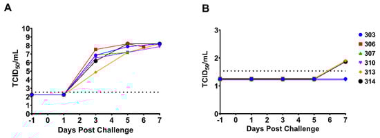 Viral titers in blood and OP swabs. (A) The log transformed viral titers (TCID50/mL) of ASFV-MNG19 in EDTA blood collected on −1, 1, 3, 5, and 7 DPC. All samples were run in triplicate. The datapoints represent the calculated titers using the Spearman–Karber method. The dashed line represents the limit of detection for the assay. Datapoints for individual pigs are represented. The single data point at 6 DPC represents samples collected from pig #306 that was found dead. (B) The log transformed viral titers (TCID50/mL) of ASFV-MNG19 in OP swabs collected on −1, 1, 3, 5, and 7 DPC. All samples were run in triplicate. The datapoints represent the calculated titers using the Spearman–Karber method. The dashed line represents the limit of detection for the assay. Datapoints for individual pigs are represented.