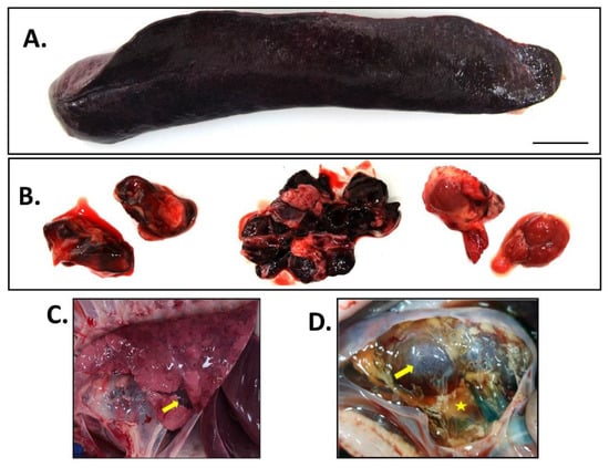 Postmortem gross lesions were assessed and scored for all euthanized and found dead pigs. Lesions were scored following the standardization guidelines established by Galindo-Cardiel et al. [] and previously described by Sunwoo et.al. [] with modifications. Briefly, gross evaluation was performed on the exterior carcass (dermis, body condition, and eyes), the thoracic cavity (heart and lungs), the abdominal cavity (stomach, liver, gall bladder, kidneys, small intestines, large intestines, and urinary bladder), as well as primary and secondary lymphoid organs including spleen, bone marrow, tonsils, and multiple lymph nodes (mandibular, cervical, tracheobronchial, gastrohepatic, mesenteric, and renal). Additional gross evaluation included oral cavity, trachea, thyroid glands, and the brain. The characterization and classification of gross lesions was performed for each organ. Gross lesions were classified as absent (0), mild (1), moderate (2), and severe (3) with an established numeric scoring system for each organ, see Supplementary Table S3.