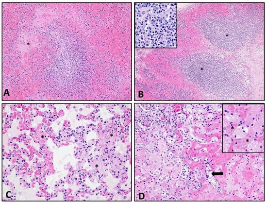 Histological lesions following ASFV-MNG19 infection. (A) Spleen: Marked lympholysis and collapse of periarterial sheaths and fibrin thrombi (asterisk) in marginal zone (100×). (B) Renal lymph node: Marked lympholysis and necrosis (asterisk and insert) with loss of cortical and sinusoidal lymphocytes accompanied by marked filling and expansion of the subcapsular and medullary sinuses with hemorrhage and fibrin (100× and 400× insert). (C) Lung: Marked expansion of the alveolar spaces by congestion, fibrin thrombi (asterisk) and necrotic cellular debris, eosinophilic proteinaceous material; edema, fibrin and occasional macrophages fill the alveolar spaces (200×). (D) Kidney: Multifocal congestion and fibrin thrombosis (insert-asterisk) of the interstitial capillaries accompanied by hemorrhage and coagulative necrosis and dystrophic mineralization (arrow) of tubules (200×, 400×-insert).