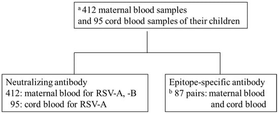 RSV (family Pneumoviridae) is a negative-sense single-stranded, enveloped RNA virus. The RSV particle envelope contains G, F, and SH spike proteins associated with neutralizing activity. RSV has a single serotype with two antigenic subtypes, subtype A (RSV-A) and subtype B (RSV-B). The amino acid sequence of the G protein varies by approximately 50% between RSV-A and RSV-B. RSV is also classified into RSV-A and RSV-B based on the G protein gene sequence, but there are other genotypes associated with the annual prevalence of RSV. However, the involvement of subtype and genotype in the severity of RSV infection is controversial. Of the envelope proteins, only the F protein is essential for cell infection; the epitope sequence of the F protein is relatively conserved [,]. The F protein can be defined as a structurally metastable prefusion type (pre-F) or stable postfusion type (post-F). Six epitopes (sites I, II, III, IV, V, and Ø [zero]) in the F protein have been reported, and epitope-specific antibodies (ESAs) have been developed [,,] (Figure 1) []. Site II exists in both pre-F and post-F and contains subtypes a and b. Subtype a (IIa) is the antigen-recognition site of palivizumab []. Among these epitopes, site Ø existing in pre-F, which induces a high-titer neutralizing antibody (NA), has garnered attention [,]. The neutralizing activity of monoclonal antibodies against site Ø is 50–100 fold higher than that of palivizumab [,], and the use of one of these antibodies, nirsevimab, considerably reduces the consultation and hospitalization rates for RSV-related lower respiratory tract infections in healthy, early-term infants under 1 year of age []. In RSV serum epidemiology, the primary method for assessing RSV immunity is the measurement of NAs; it quantifies the serum functional capacity to neutralize RSV infectivity []. Infants born to mothers with high NA titers (NATs) against RSV are spared from severe RSV infections during the first few months of life [], and those with high NATs against RSV do not experience severe RSV infections []. This fact shaped the current RSV prophylaxis, which involves the administration of anti-RSV monoclonal antibody, palivizumab, to high-risk children. Several vaccines against RSV have been developed, and ongoing clinical trials are testing a live attenuated vaccine for infants and a subunit vaccine (maternal vaccine) for pregnant women []. The transfer of maternal antibodies to infants has been investigated using NATs against live RSV and the titer of a palivizumab-like antibody against site IIa []. However, only a few qualitative evaluations of NAs against RSVs in neonates have been conducted that have considered specific antibodies against each neutralizing epitope, including site Ø [,]. Hence, here, we measured NATs against RSV and neutralizing ESA levels using mother–infant paired serum samples collected at birth to qualitatively evaluate the NAs against RSV in transition antibodies.