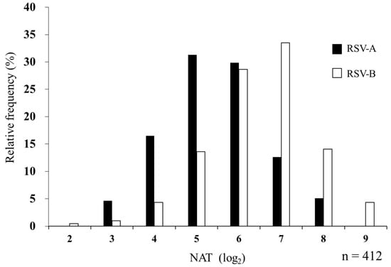 Relative frequency histogram of serum NAT against RSV-A and RSV-B in maternal blood. In total, 412 MB samples were evaluated for NATs against RSV-A and RSV-B. The maximum dilution of serum that suppressed the appearance of viral CPE by 50% is represented by log2 as NAT. Black and white bars indicate NATs against RSV-A and RSV-B, respectively.
