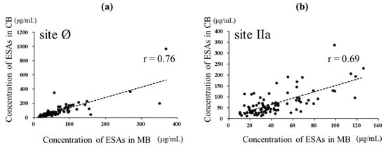 Relationship between ESAs specific to sites Ø and IIa in maternal and cord blood. In total, 87 MB and CB paired samples were evaluated for ESAs. (a) Relationship between the ESA level specific to site Ø in MB and CB. The broken line represents linear regression (r = 0.76, p < 0.001)). (b) Relationship between the level of ESA specific to site IIa in MB and CB. The broken line represents linear regression (r = 0.69, p < 0.001). Pearson’s product-moment correlation coefficient.